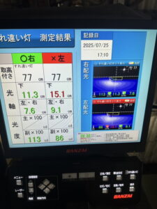 ヘッドライトの光軸をテスターで測定し、調整を行いました。