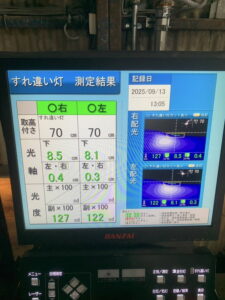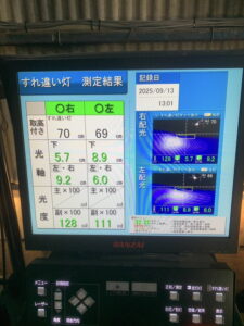 ヘッドライトの光軸をテスターで測定し、調整を行いました。