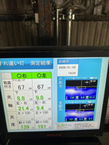 ヘッドライトの光軸をテスターで測定し、調整を行いました。