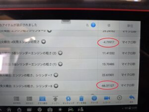 コンピューター診断にて測定診断をしたところ4番と8番シリンダーが不調で特に8番が完全に失火しておりました。