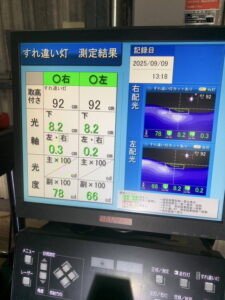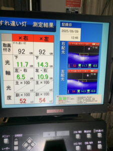 ヘッドライトの光軸をテスターで測定し、調整を行いました。