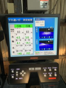 ヘッドライトの光軸をテスターで測定し、調整を行いました。