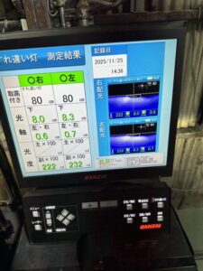 ヘッドライトの光軸をテスターで測定し、調整を行いました。