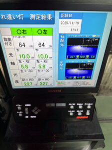 ヘッドライトの光軸をテスターで測定し、調整を行いました。