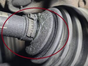 足回りの点検時に、ドライブシャフトブーツのアウター側が切れておりグリスが飛散しておりました。