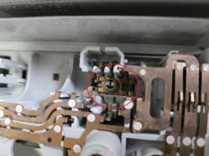 赤い丸印の箇所にバネがあり、銅板を押さえてながらスライドする大事な役目をしている様です。