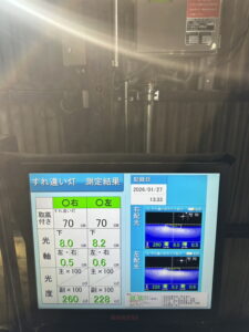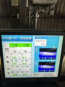 ヘッドライトの光軸をテスターで測定し、調整を行いました。