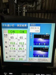 ヘッドライトの光軸をテスターで測定し、調整を行いました。