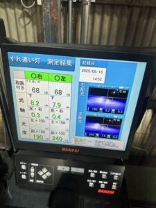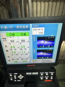 ヘッドライトの光軸をテスターで測定し、調整を行いました。